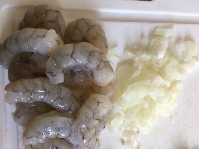 Use uncooked cleaned and deveined jumbo shrimp, and chop some onions
