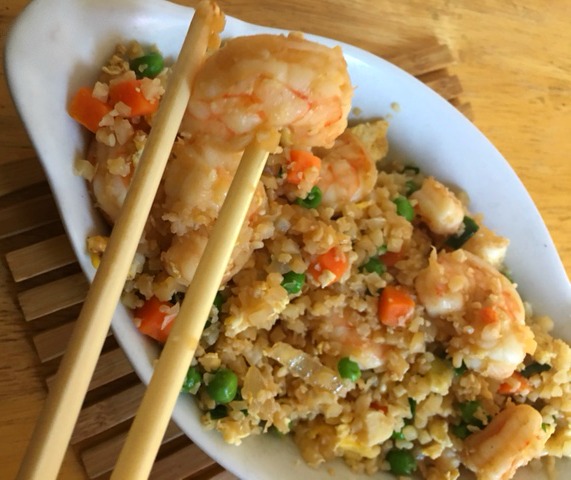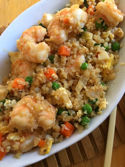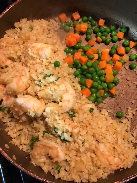 Heat the sesame oil in a skillet or wok. Saute the garlic and onions for a couple of minutes and then add the shrimp and cook for a minute (it will start to turn pink). Stir in the cauliflower and stir fry, add the peas and carrots to the side of the skillet, mix it into the cauliflower and continue stir frying, stir in the soy sauce and then move to the side of the skillet and scramble the eggs on the other side of the skillet. Combine the eggs into the cauliflower and shrimp.