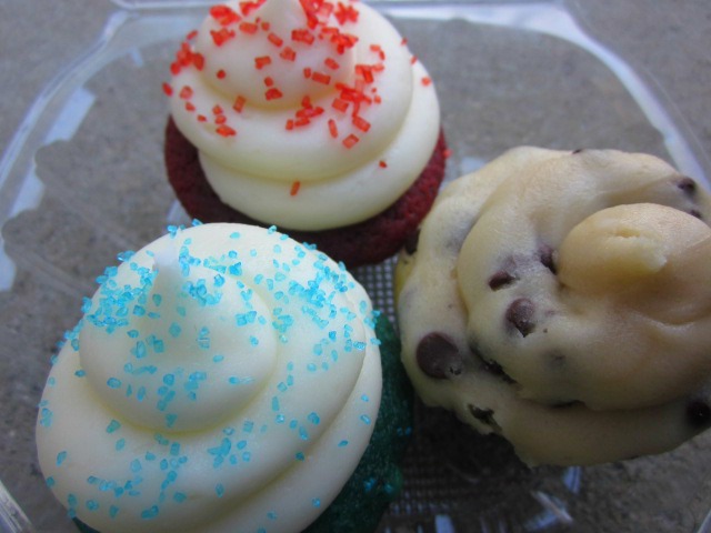 Red Velvet, Blue Velvet and Vanilla Chocolate Chip Cookie Dough Cupcakes from Sweet E's