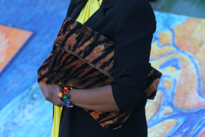 Blazer: Macys, Yellow Shift Dress: Burlington Coat Factory, Shoes: JC Penney, Tiger Clutch: DIY, Earrings and Bracelet: F-21