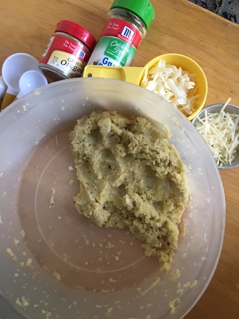 Put your cauliflower in a food processor and blend until it is the consistency of snow. (You can try using a cheese grater if you do not have a food processor). Put your cauliflower in a bowl and microwave for 5 minutes. Let it cool and wrap all of the cauliflower in a towel and squeeze all the water out of it. Once you have removed all the water from the cauliflower, put it in a dry bowl and mix in the spices, cheese and egg. You will end up with a cauliflower dough.